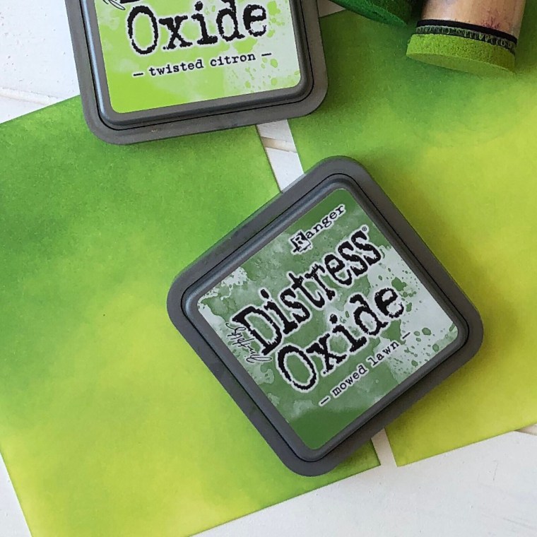 This card came together so quick and easy! I started with blending distress oxide inks on a piece of Neenah solar white cardstock in colours mowed lawn and twisted citron. I then die cut using the stars on the border die.
